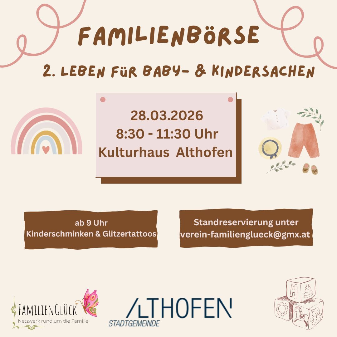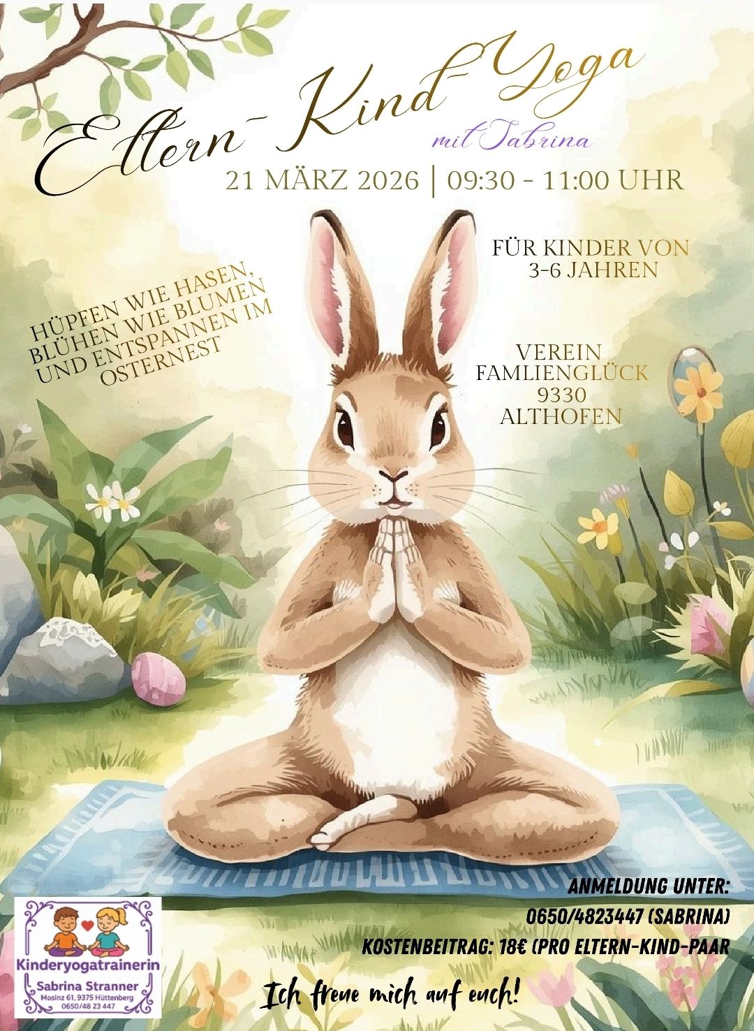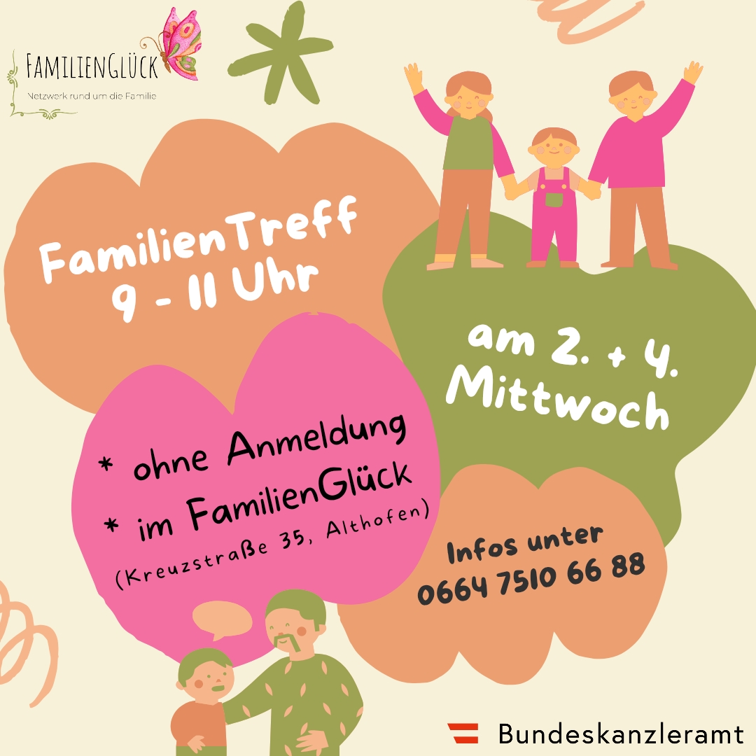 Diese Veranstaltung richtet sich an alle Familien in und rund um Althofen und wird aus Mitteln des Landes Kärnten, Gesunde Gemeinde und dem Verein „FamilienGlück – Netzwerk rund um die Familie“ finanziert und daher kostenfrei angeboten. Wir freuen uns über deinen freiwilligen Wertschätzungsbeitrag.