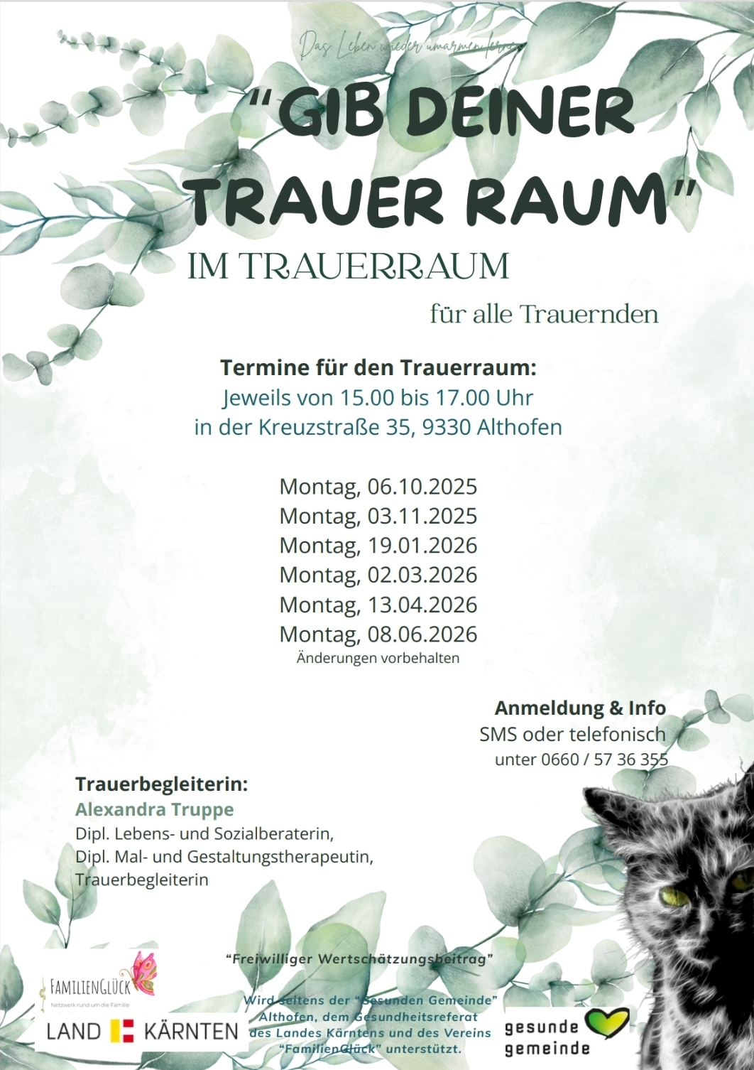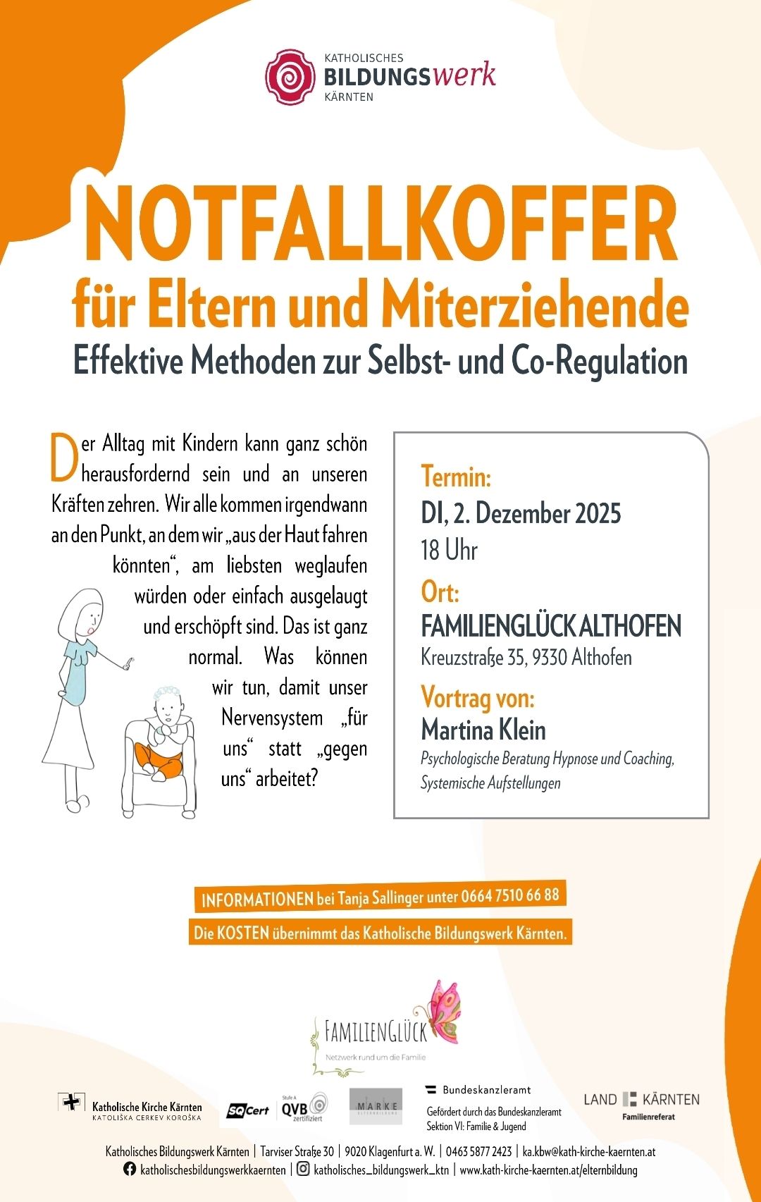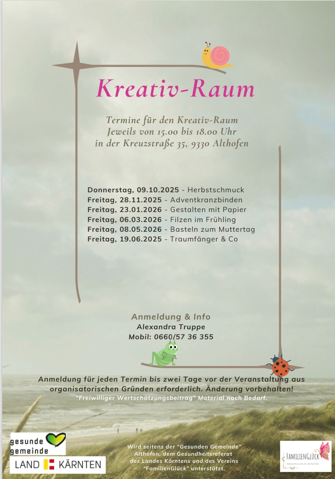 Diese Veranstaltung richtet sich an alle Familien in und rund um Althofen und wird aus Mitteln des Landes Kärnten, Gesunde Gemeinde und dem Verein „FamilienGlück – Netzwerk rund um die Familie“ finanziert und daher kostenfrei angeboten. Wir freuen uns über deinen freiwilligen Wertschätzungsbeitrag.