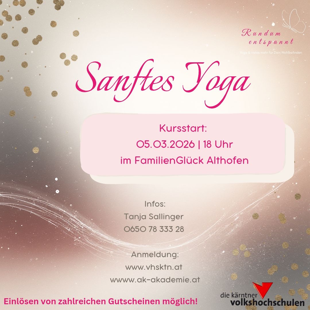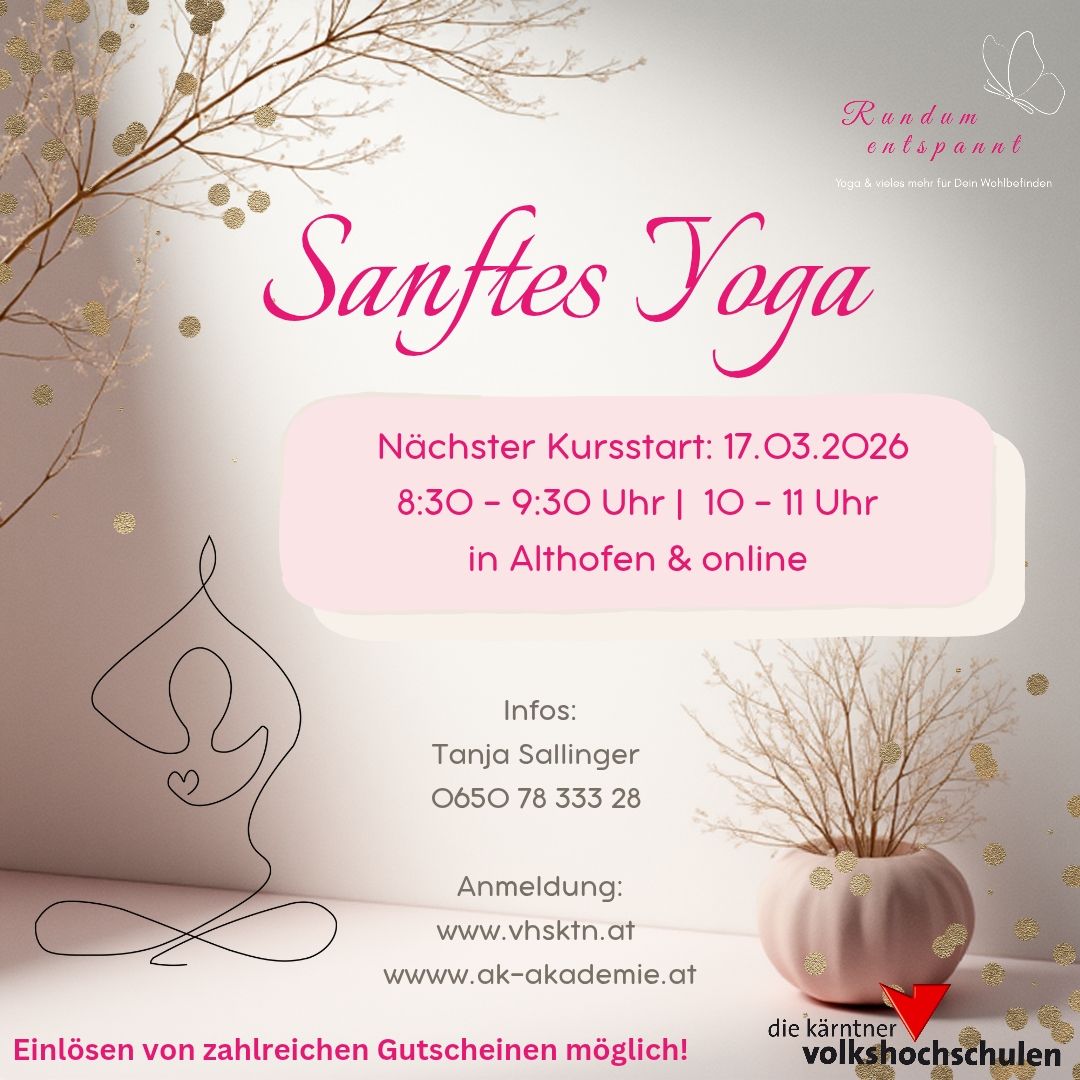 Dieser Kurs richtet sich an alle, die ihrem Körper und Geist auf achtsame Weise etwas Gutes tun möchten. Sanftes Yoga verbindet ruhige, fließende Bewegungen mit bewusster Atmung und fördert so Wohlbefinden und innere Balance.